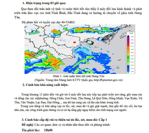 TIN CẢNH BÁO DÔNG, LỐC, SÉT, MƯA ĐÁ VÀ MƯA LỚN CỤC BỘ TRÊN KHU VỰC TỈNH HƯNG YÊN (ngày 05/8/2025 - Lần 1)