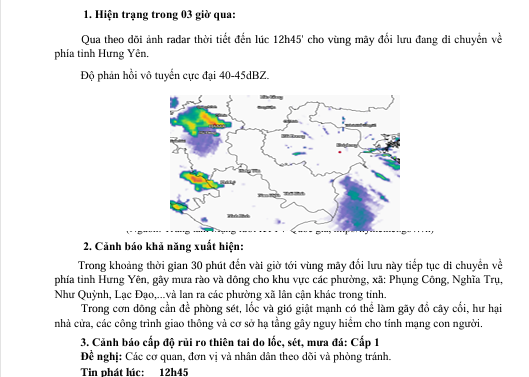 TIN CẢNH BÁO DÔNG, LỐC, SÉT, MƯA ĐÁ VÀ MƯA LỚN CỤC BỘ TRÊN KHU VỰC TỈNH HƯNG YÊN (ngày 06/7/2025 - Lần 2)