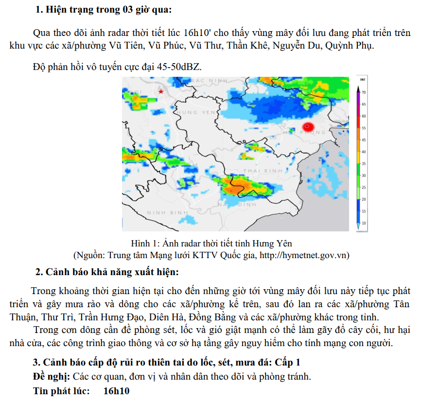 TIN CẢNH BÁO DÔNG, LỐC, SÉT, MƯA ĐÁ VÀ MƯA LỚN CỤC BỘ TRÊN KHU VỰC TỈNH HƯNG YÊN (ngày 13/7/2025 - Lần 3)