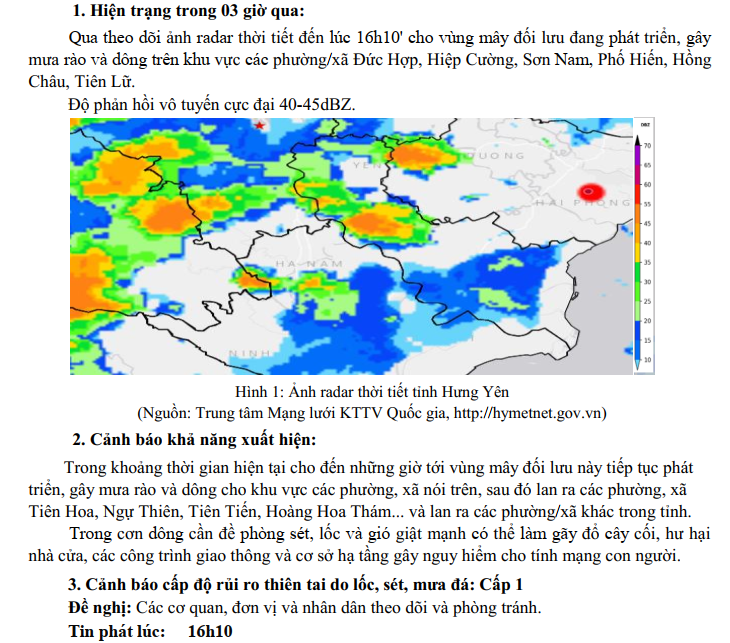 TIN CẢNH BÁO DÔNG, LỐC, SÉT, MƯA ĐÁ VÀ MƯA LỚN CỤC BỘ TRÊN KHU VỰC TỈNH HƯNG YÊN (ngày 14/7/2025 - Lần 3)