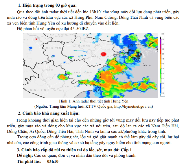 TIN CẢNH BÁO DÔNG, LỐC, SÉT, MƯA ĐÁ VÀ MƯA LỚN CỤC BỘ TRÊN KHU VỰC TỈNH HƯNG YÊN (ngày 15/7/2025 - Lần 1)