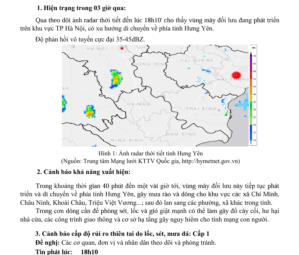 TIN CẢNH BÁO DÔNG, LỐC, SÉT, MƯA ĐÁ VÀ MƯA LỚN CỤC BỘ TRÊN KHU VỰC TỈNH HƯNG YÊN (ngày 16/7/2025 - Lần 1)