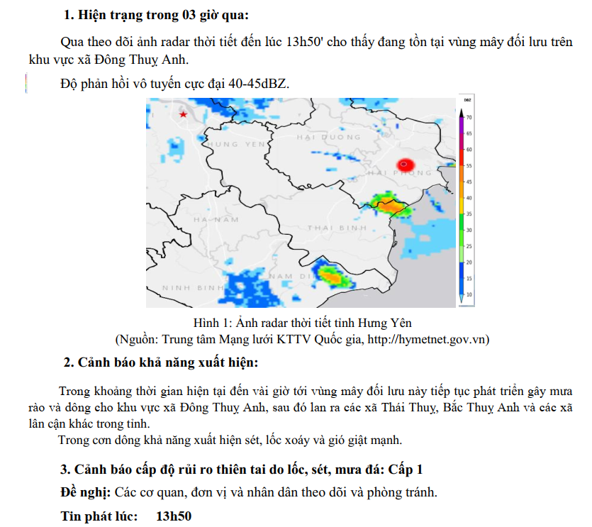 TIN CẢNH BÁO DÔNG, LỐC, SÉT, MƯA ĐÁ VÀ MƯA LỚN CỤC BỘ TRÊN KHU VỰC TỈNH HƯNG YÊN (ngày 28/7/2025 - Lần 1)