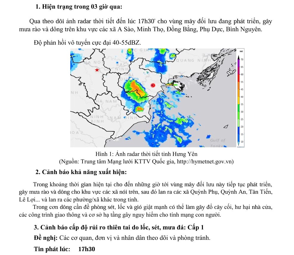 TIN CẢNH BÁO DÔNG, LỐC, SÉT, MƯA ĐÁ VÀ MƯA LỚN CỤC BỘ TRÊN KHU VỰC TỈNH HƯNG YÊN (ngày 30/7/2025 - Lần 1)