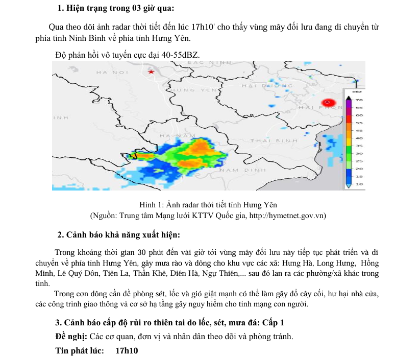TIN CẢNH BÁO DÔNG, LỐC, SÉT, MƯA ĐÁ VÀ MƯA LỚN CỤC BỘ TRÊN KHU VỰC TỈNH HƯNG YÊN (ngày 31/7/2025 - Lần 1)