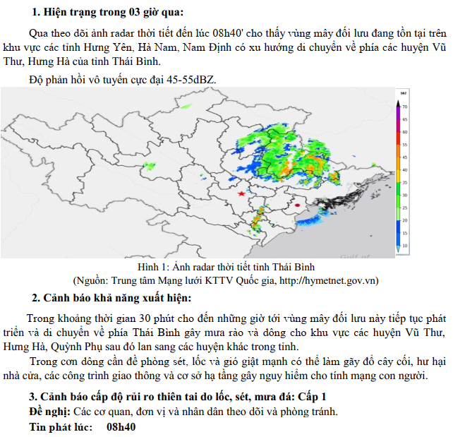 TIN CẢNH BÁO DÔNG, LỐC, SÉT, MƯA ĐÁ VÀ MƯA LỚN CỤC BỘ TRÊN KHU VỰC TỈNH THÁI BÌNH (08h40 ngày 22/6/2025 - Lần 2)