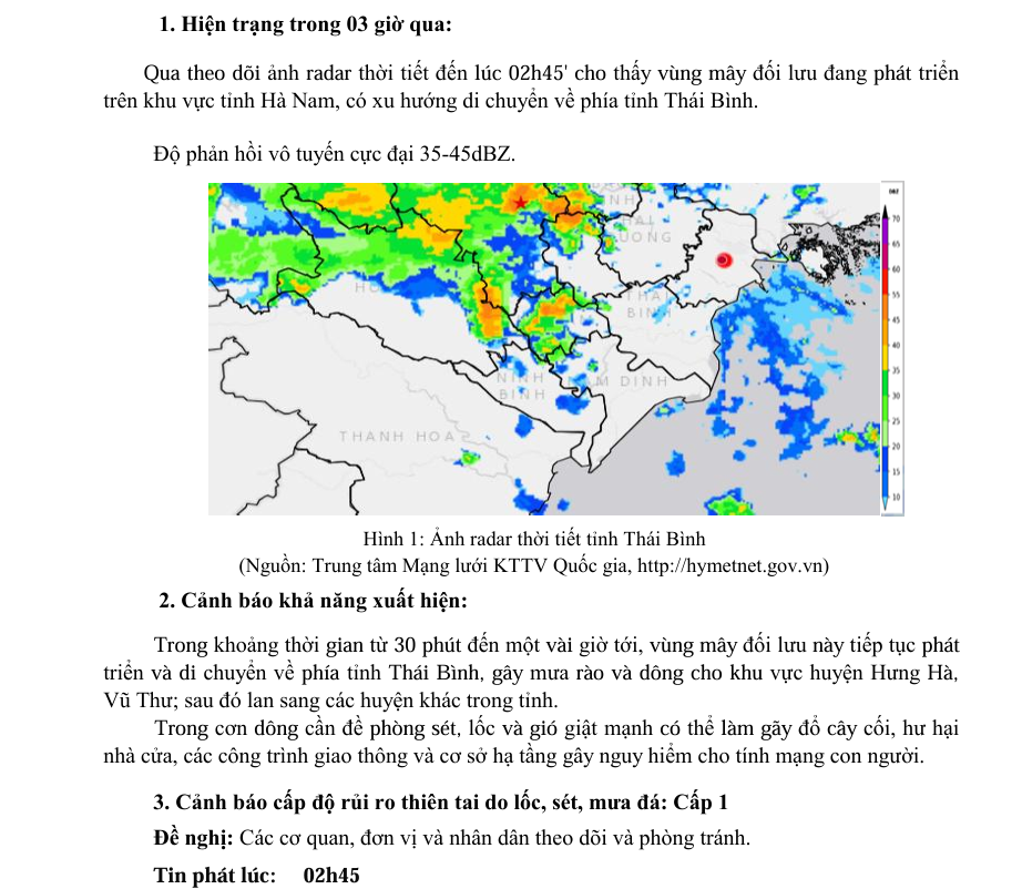 TIN CẢNH BÁO DÔNG, LỐC, SÉT, MƯA ĐÁ VÀ MƯA LỚN CỤC BỘ TRÊN KHU VỰC TỈNH THÁI BÌNH (Ngày 04/6/2025 - Lần 1)