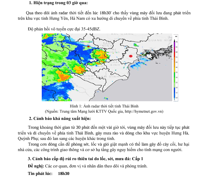 TIN CẢNH BÁO DÔNG, LỐC, SÉT, MƯA ĐÁ VÀ MƯA LỚN CỤC BỘ TRÊN KHU VỰC TỈNH THÁI BÌNH (Ngày 07/6/2025 - Lần 1)