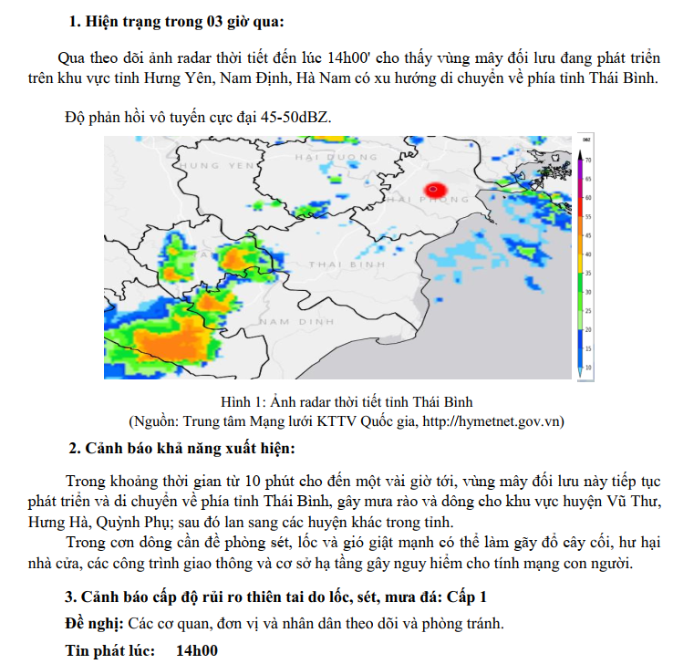 TIN CẢNH BÁO DÔNG, LỐC, SÉT, MƯA ĐÁ VÀ MƯA LỚN CỤC BỘ TRÊN KHU VỰC TỈNH THÁI BÌNH (Ngày 08/6/2025 - Lần 1)