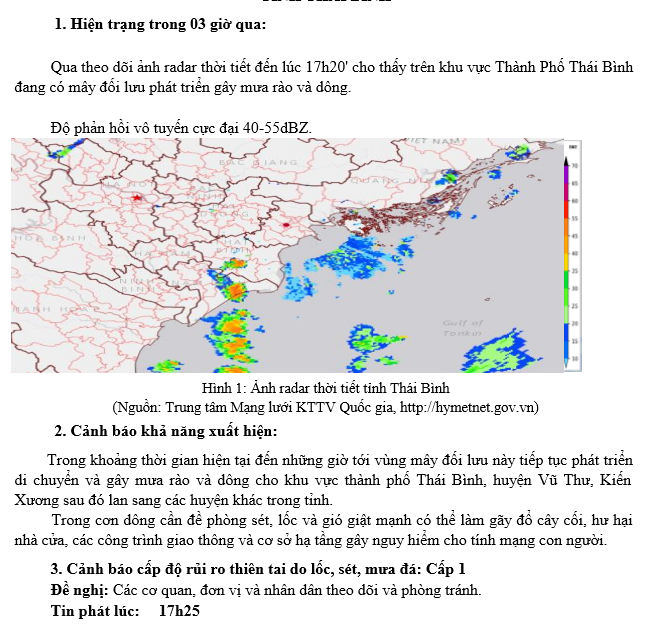 TIN CẢNH BÁO DÔNG, LỐC, SÉT, MƯA ĐÁ VÀ MƯA LỚN CỤC BỘ TRÊN KHU VỰC TỈNH THÁI BÌNH (Ngày 13/6/2025 - Lần 2)