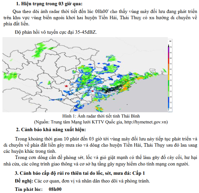 TIN CẢNH BÁO DÔNG, LỐC, SÉT, MƯA ĐÁ VÀ MƯA LỚN CỤC BỘ TRÊN KHU VỰC TỈNH THÁI BÌNH (ngày 27/6/2025 - Lần 2)