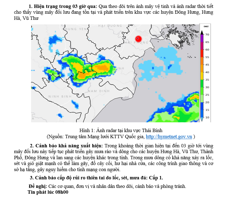 TIN CẢNH BÁO DÔNG, TỐ, LỐC, SÉT, MƯA ĐÁ VÀ MƯA LỚN CỤC BỘ TRÊN KHU VỰC TỈNH THÁI BÌNH ( Ngày 21/9/2024 - Lần 2)