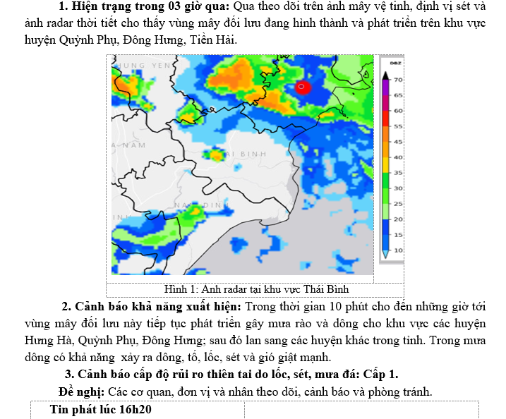 TIN CẢNH BÁO DÔNG, TỐ, LỐC, SÉT, MƯA ĐÁ VÀ MƯA LỚN CỤC BỘ TRÊN KHU VỰC TỈNH THÁI BÌNH (LẦN 1)