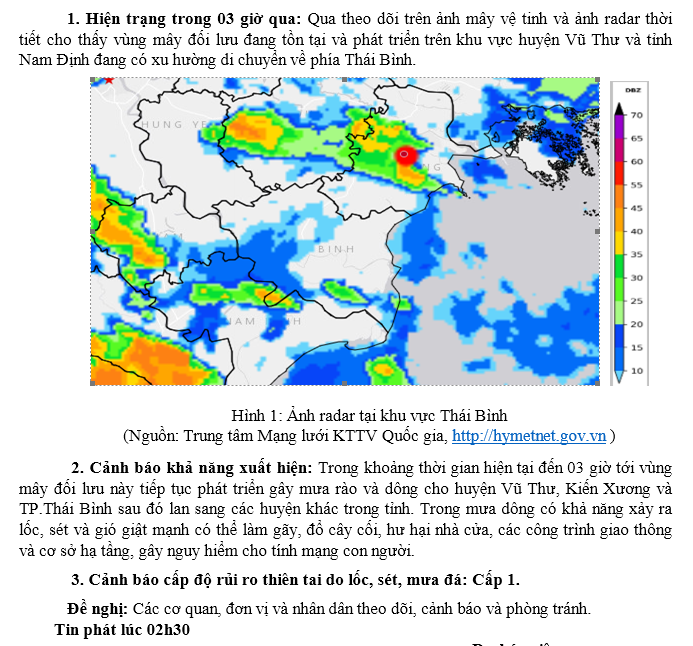 TIN CẢNH BÁO DÔNG, TỐ, LỐC, SÉT, MƯA ĐÁ VÀ MƯA LỚN CỤC BỘ TRÊN KHU VỰC TỈNH THÁI BÌNH (Ngày 01/10/2024 - Lần 1)