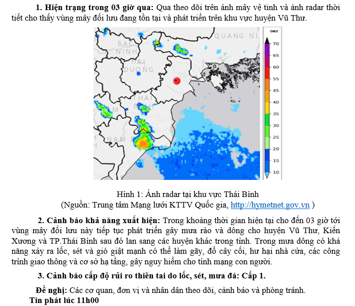 TIN CẢNH BÁO DÔNG, TỐ, LỐC, SÉT, MƯA ĐÁ VÀ MƯA LỚN CỤC BỘ TRÊN KHU VỰC TỈNH THÁI BÌNH (Ngày 01/10/2024 - Lần 3)