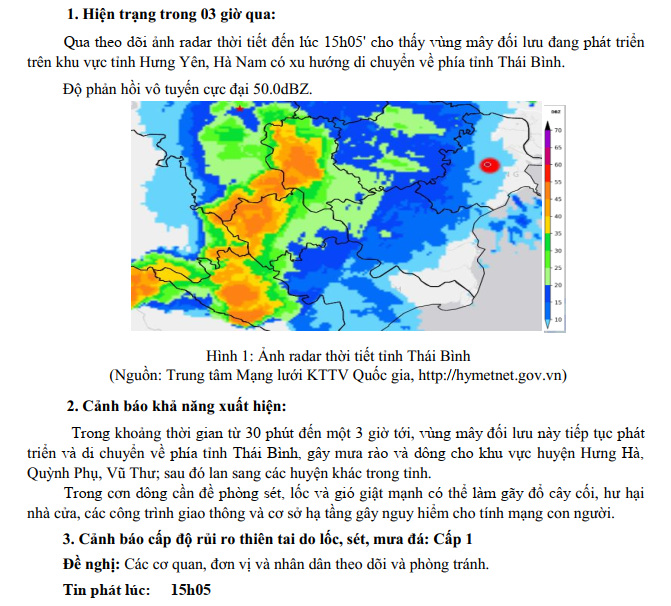 TIN CẢNH BÁO DÔNG, TỐ, LỐC, SÉT, MƯA ĐÁ VÀ MƯA LỚN CỤC BỘ TRÊN KHU VỰC TỈNH THÁI BÌNH (Ngày 04/5/2025 - Lần 1)