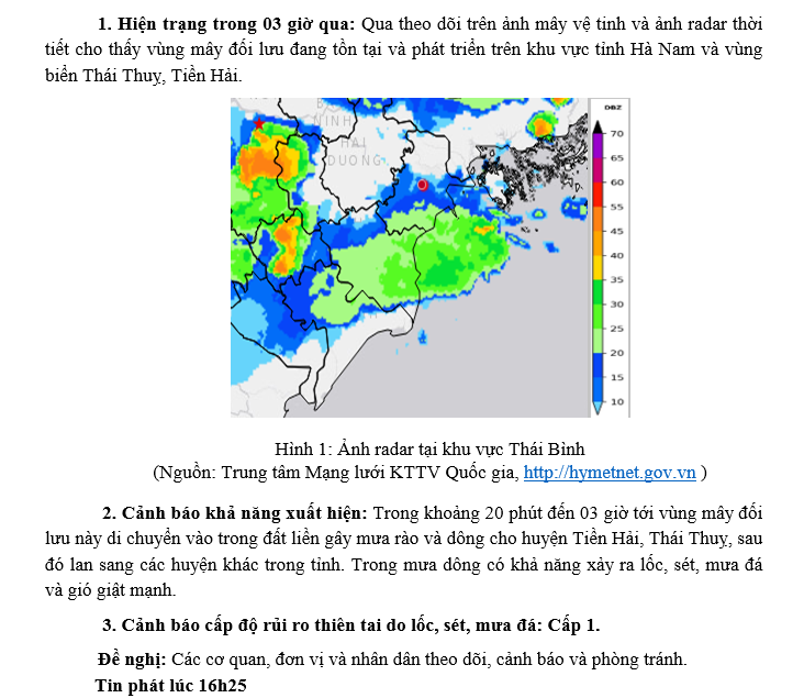 TIN CẢNH BÁO DÔNG, TỐ, LỐC, SÉT, MƯA ĐÁ VÀ MƯA LỚN CỤC BỘ TRÊN KHU VỰC TỈNH THÁI BÌNH NGÀY 04/6/2024( Lần 3)