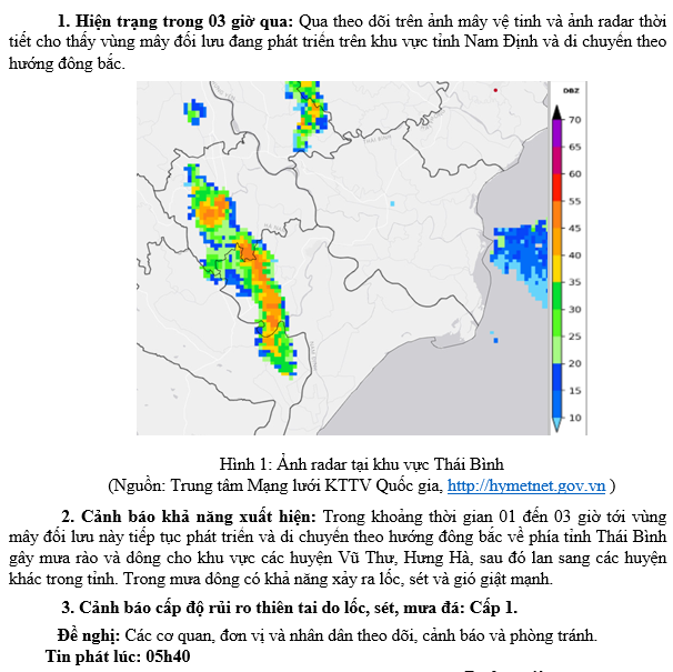 TIN CẢNH BÁO DÔNG, TỐ, LỐC, SÉT, MƯA ĐÁ VÀ MƯA LỚN CỤC BỘ TRÊN KHU VỰC TỈNH THÁI BÌNH NGÀY 04/7/2024 (Lần 1)
