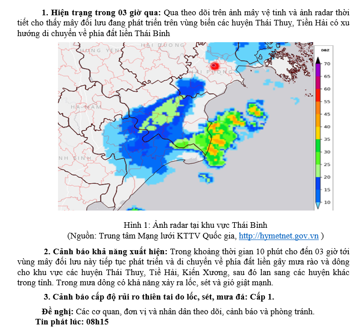 TIN CẢNH BÁO DÔNG, TỐ, LỐC, SÉT, MƯA ĐÁ VÀ MƯA LỚN CỤC BỘ TRÊN KHU VỰC TỈNH THÁI BÌNH NGÀY 06/7/2024 (Lần 1)