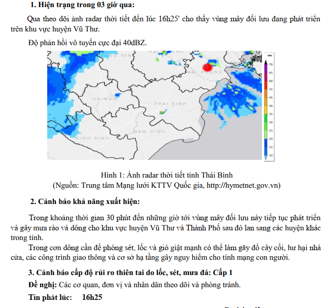 TIN CẢNH BÁO DÔNG, TỐ, LỐC, SÉT, MƯA ĐÁ VÀ MƯA LỚN CỤC BỘ TRÊN KHU VỰC TỈNH THÁI BÌNH (Ngày 09/5/2025 - Lần 1)