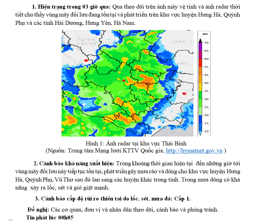 TIN CẢNH BÁO DÔNG, TỐ, LỐC, SÉT, MƯA ĐÁ VÀ MƯA LỚN CỤC BỘ TRÊN KHU VỰC TỈNH THÁI BÌNH NGÀY 09/6/2024( Lần 1)