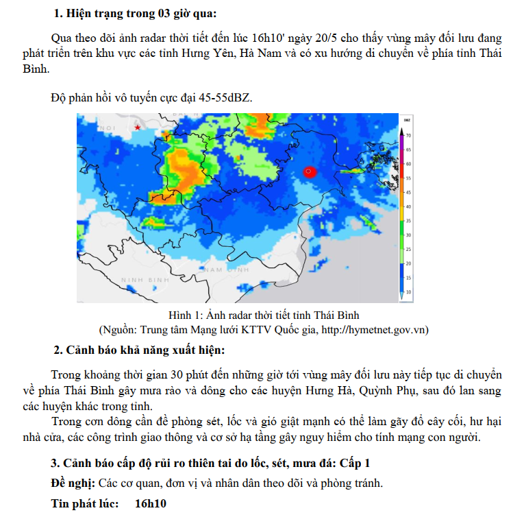 TIN CẢNH BÁO DÔNG, TỐ, LỐC, SÉT, MƯA ĐÁ VÀ MƯA LỚN CỤC BỘ TRÊN KHU VỰC TỈNH THÁI BÌNH (Ngày 20/5/2025 - Lần 1)