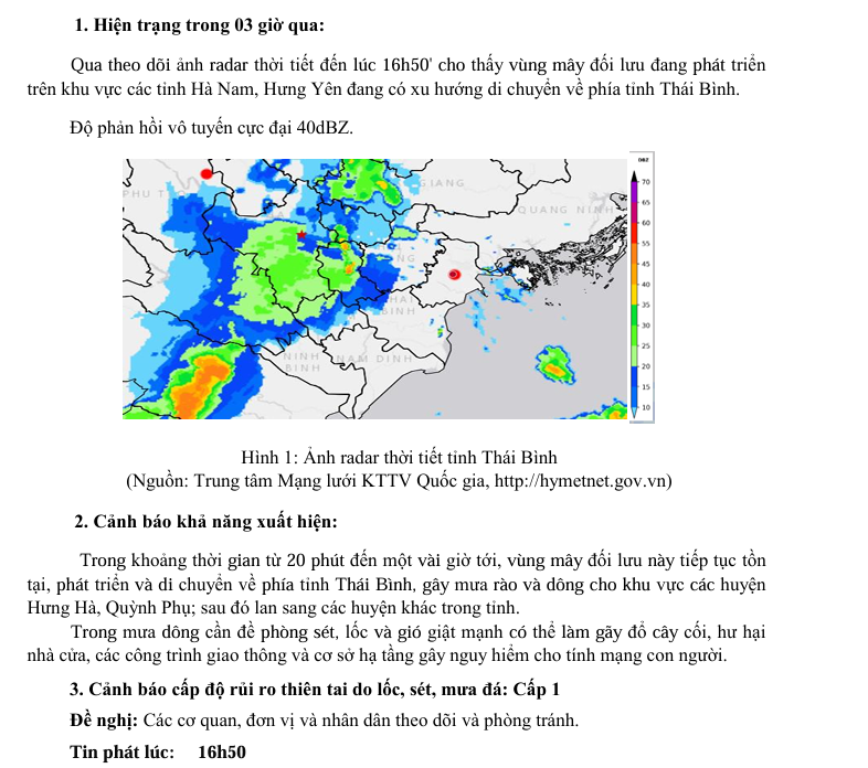 TIN CẢNH BÁO DÔNG, TỐ, LỐC, SÉT, MƯA ĐÁ VÀ MƯA LỚN CỤC BỘ TRÊN KHU VỰC TỈNH THÁI BÌNH (Ngày 21/4/2025 - Lần 1)