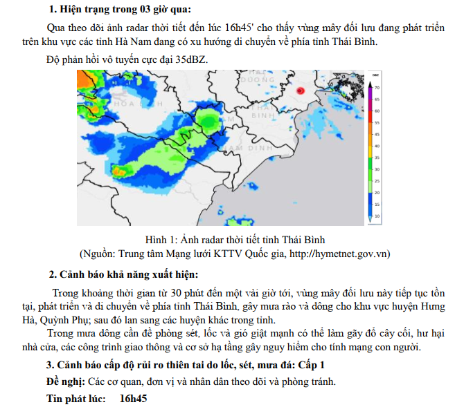 TIN CẢNH BÁO DÔNG, TỐ, LỐC, SÉT, MƯA ĐÁ VÀ MƯA LỚN CỤC BỘ TRÊN KHU VỰC TỈNH THÁI BÌNH (Ngày 24/4/2025 - Lần 1)