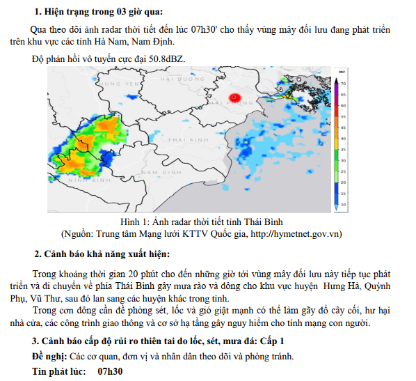 TIN CẢNH BÁO DÔNG, TỐ, LỐC, SÉT, MƯA ĐÁ VÀ MƯA LỚN CỤC BỘ TRÊN KHU VỰC TỈNH THÁI BÌNH (Ngày 27/4/2025 - Lần 1 )