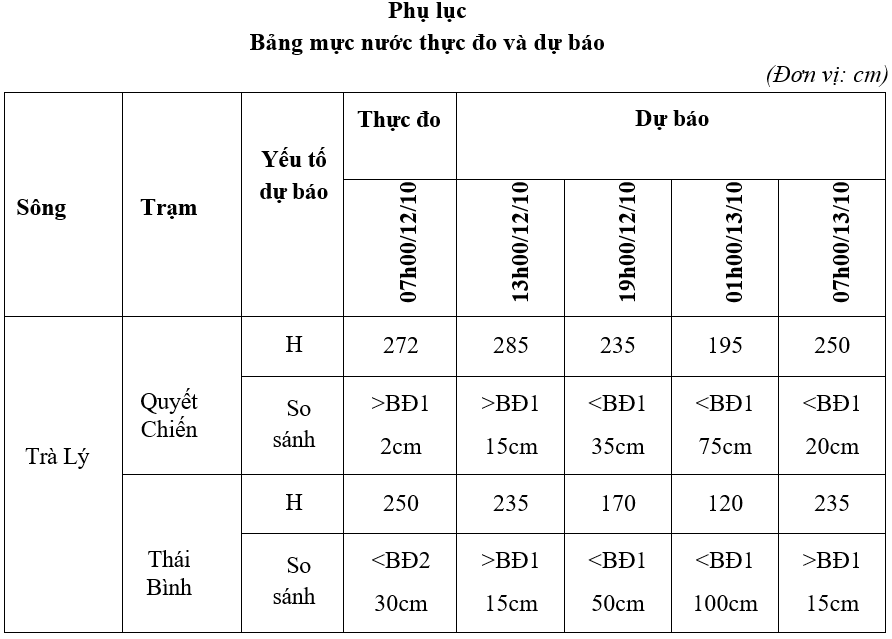 Trong khoảng 18-24h tiếp theo, mực nước các trạm trên sông Trà Lý lên lại theo thủy triều. Đến 07h ngày 12/10, mực nước tại trạm Thái Bình cao hơn báo động BĐI, trạm Quyết Chiến thấp hơn báo động I. (chi tiết tại phụ lục).