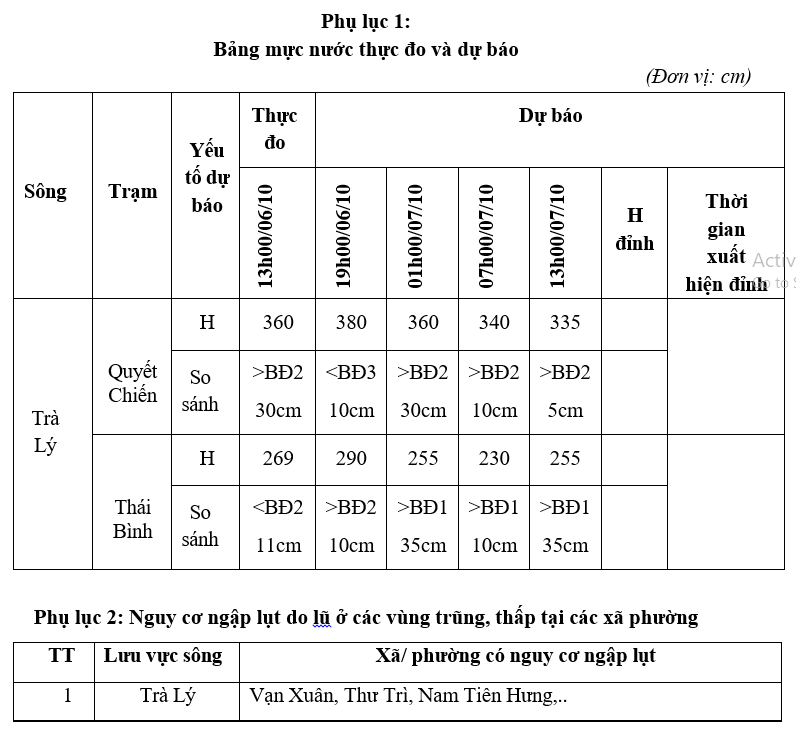 - Mực nước lúc 13h00 (ngày 06/10) trên sông Trà Lý tại Quyết Chiến: 3,60m (>BĐII: 0,30m), tại trạm Thái Bình 2,69m (