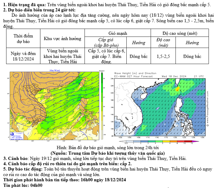 TIN DỰ BÁO GIÓ MẠNH, SÓNG LỚN TRÊN VÙNG BIỂN TỈNH THÁI BÌNH (04h00 NGÀY 18/12/2024)