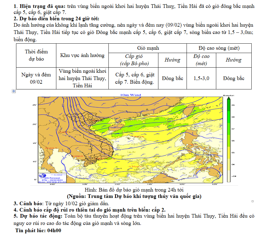 TIN DỰ BÁO GIÓ MẠNH, SÓNG LỚN TRÊN VÙNG BIỂN TỈNH THÁI BÌNH (4H NGÀY 09/02/2024)