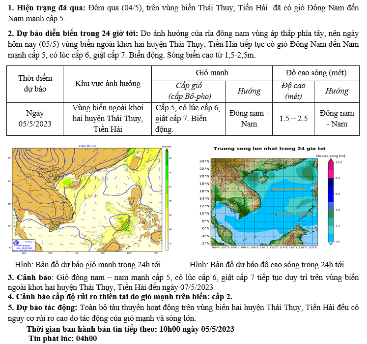 TIN DỰ BÁO GIÓ MẠNH, SÓNG LỚN TRÊN BIỂN (04h ngày 05/5/2023)