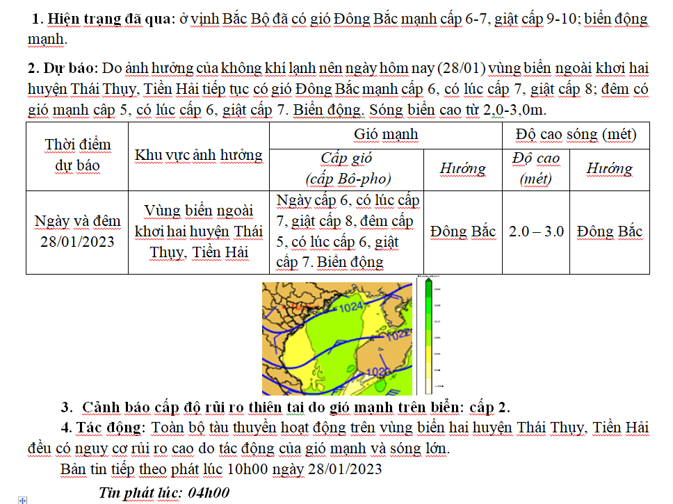 TIN DỰ BÁO GIÓ MẠNH, SÓNG LỚN TRÊN BIỂN (04h ngày 28/01/2023)