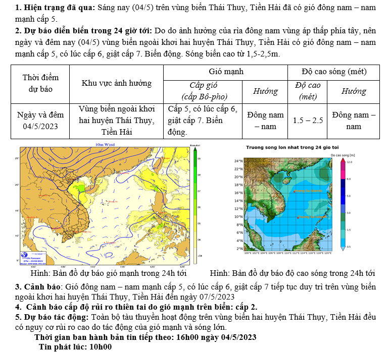TIN DỰ BÁO GIÓ MẠNH, SÓNG LỚN TRÊN BIỂN (10h ngày 04/5/2023)