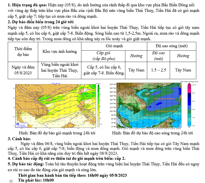 TIN DỰ BÁO GIÓ MẠNH, SÓNG LỚN TRÊN BIỂN (10h ngày 05/8/2023)