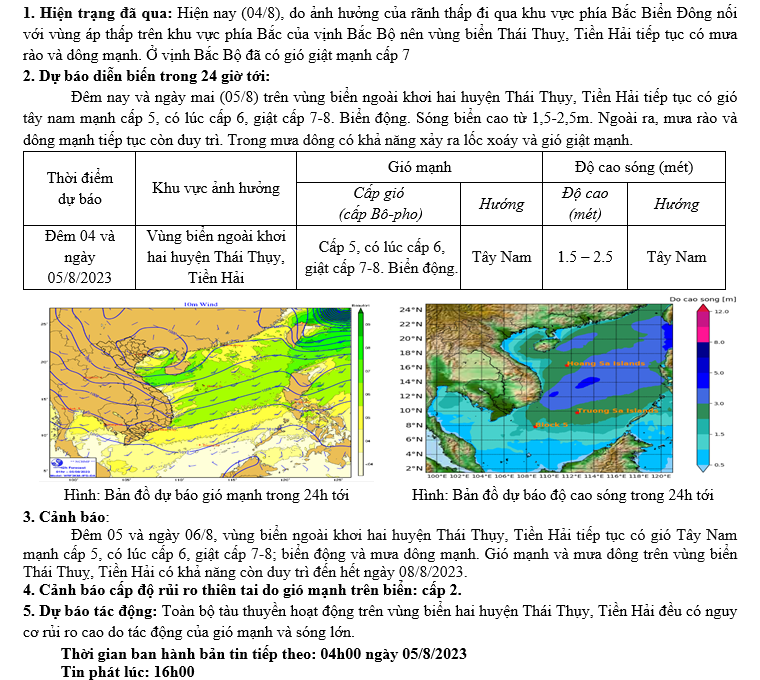 TIN DỰ BÁO GIÓ MẠNH, SÓNG LỚN TRÊN BIỂN (16h ngày 04/8/2023)