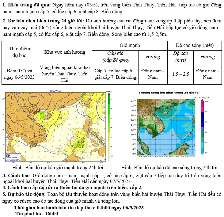 TIN DỰ BÁO GIÓ MẠNH, SÓNG LỚN TRÊN BIỂN (16h ngày 05/5/2023)