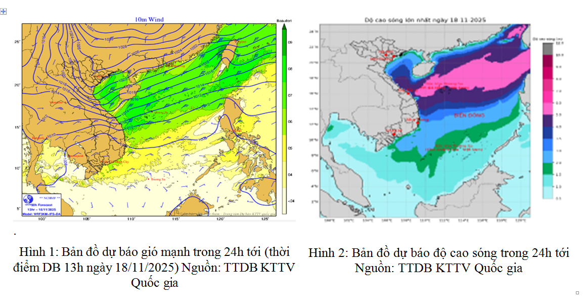 Ngày và đêm nay (18/11), vùng biển các xã trên có gió Đông bắc mạnh cấp 6, cấp 7, giật cấp 8-9, biển động mạnh; sóng biển cao từ 2.0-3.5m, hướng Đông bắc.