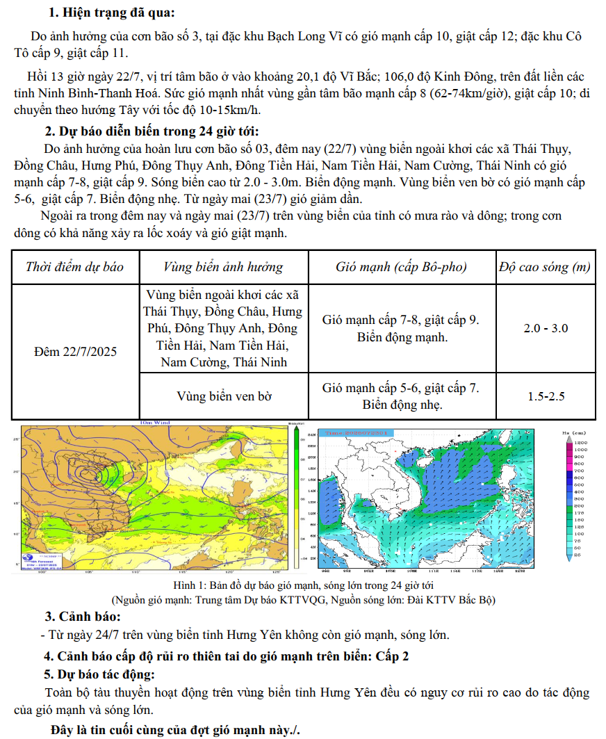 TIN DỰ BÁO GIÓ MẠNH, SÓNG LỚN TRÊN VÙNG BIỂN KHU VỰC HƯNG YÊN (16h00 ngày 22/7/2025)