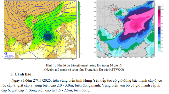 • TIN DỰ BÁO GIÓ MẠNH, SÓNG LỚN TRÊN VÙNG BIỂN TỈNH HƯNG YÊN (04h00 ngày 27/11/2025)