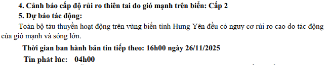 TIN DỰ BÁO GIÓ MẠNH, SÓNG LỚN TRÊN VÙNG BIỂN TỈNH HƯNG YÊN (04h00 ngày 26/11/2025)