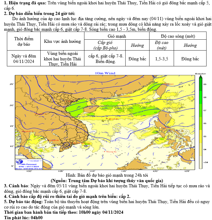 TIN DỰ BÁO GIÓ MẠNH, SÓNG LỚN TRÊN VÙNG BIỂN TỈNH THÁI BÌNH (04h00 NGÀY 04/11/2024)