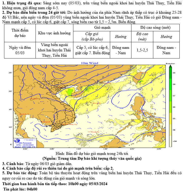 TIN DỰ BÁO GIÓ MẠNH, SÓNG LỚN TRÊN VÙNG BIỂN TỈNH THÁI BÌNH (04H00 NGÀY 05/03/2024)