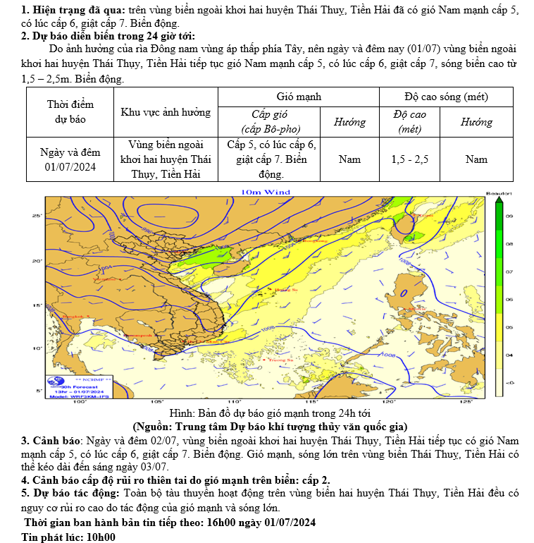 TIN DỰ BÁO GIÓ MẠNH, SÓNG LỚN TRÊN VÙNG BIỂN TỈNH THÁI BÌNH (10H00 NGÀY 01/07/2024)