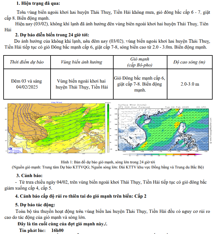TIN DỰ BÁO GIÓ MẠNH, SÓNG LỚN TRÊN VÙNG BIỂN TỈNH THÁI BÌNH (16h00 NGÀY 03/02/2025)