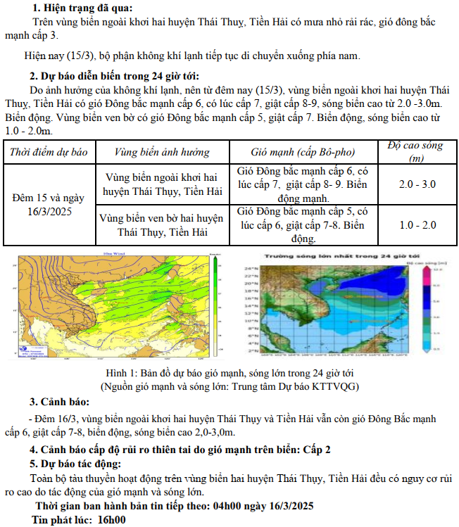 TIN DỰ BÁO GIÓ MẠNH, SÓNG LỚN TRÊN VÙNG BIỂN TỈNH THÁI BÌNH (16h00 NGÀY 15/3/2025)