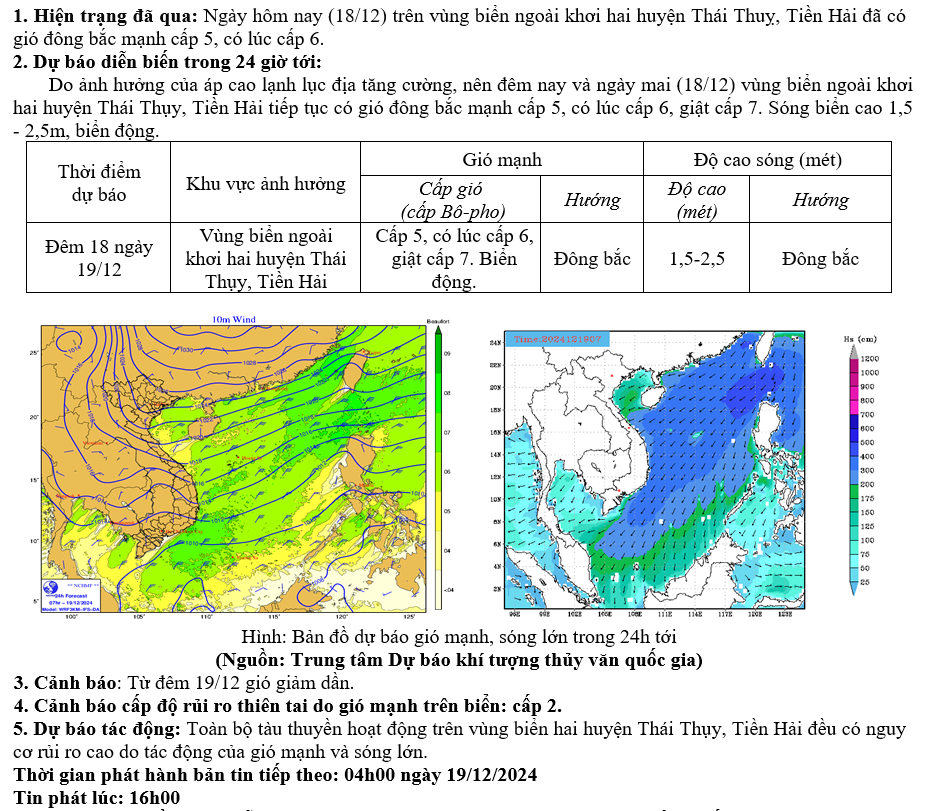 TIN DỰ BÁO GIÓ MẠNH, SÓNG LỚN TRÊN VÙNG BIỂN TỈNH THÁI BÌNH (16h00 NGÀY 18/12/2024)