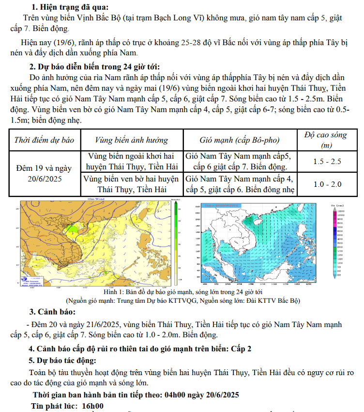 TIN DỰ BÁO GIÓ MẠNH, SÓNG LỚN TRÊN VÙNG BIỂN TỈNH THÁI BÌNH (16h00 NGÀY 19/6/2025)